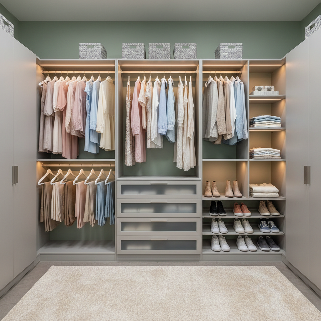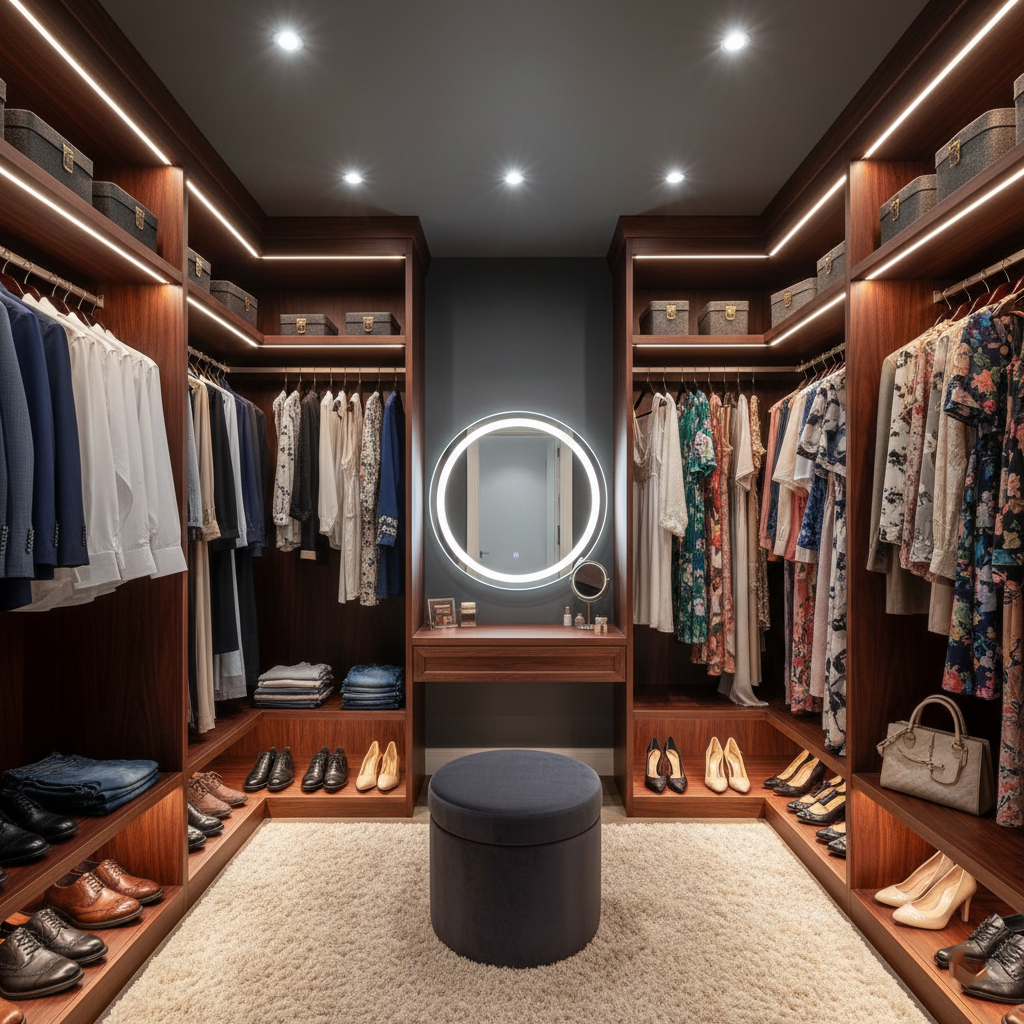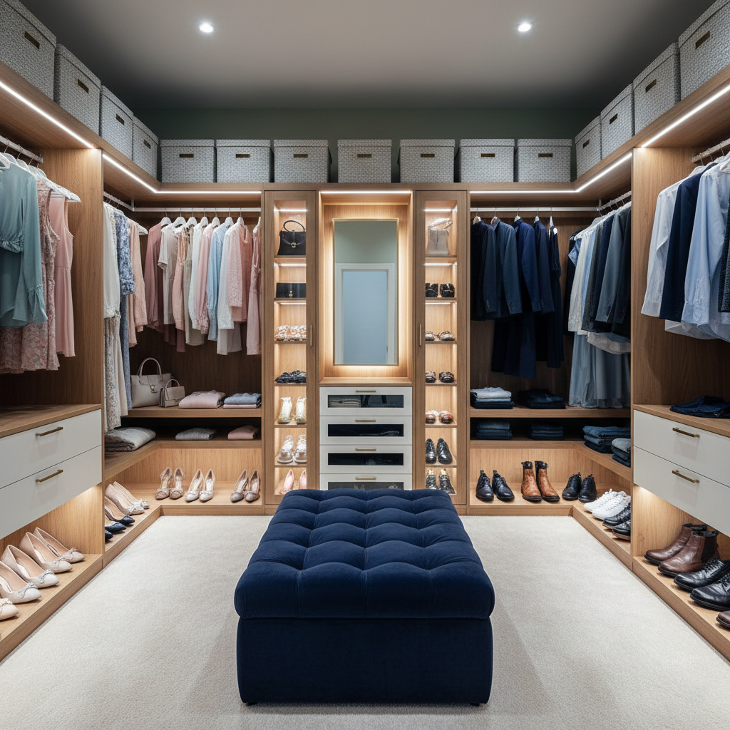 We focus on flow, lighting, and storage efficiency, creating personalized walk-in wardrobe design solutions that feel both luxurious and practical. Many walk-in designs feature custom wardrobe systems with hanging space, shelving, drawers, and shoe storage designed specifically for your collection.